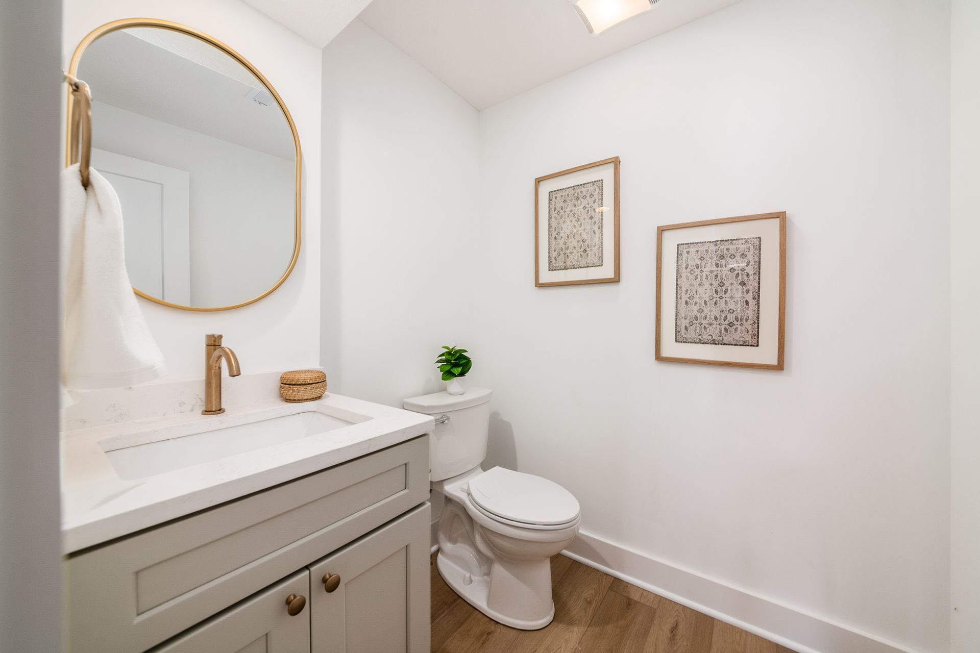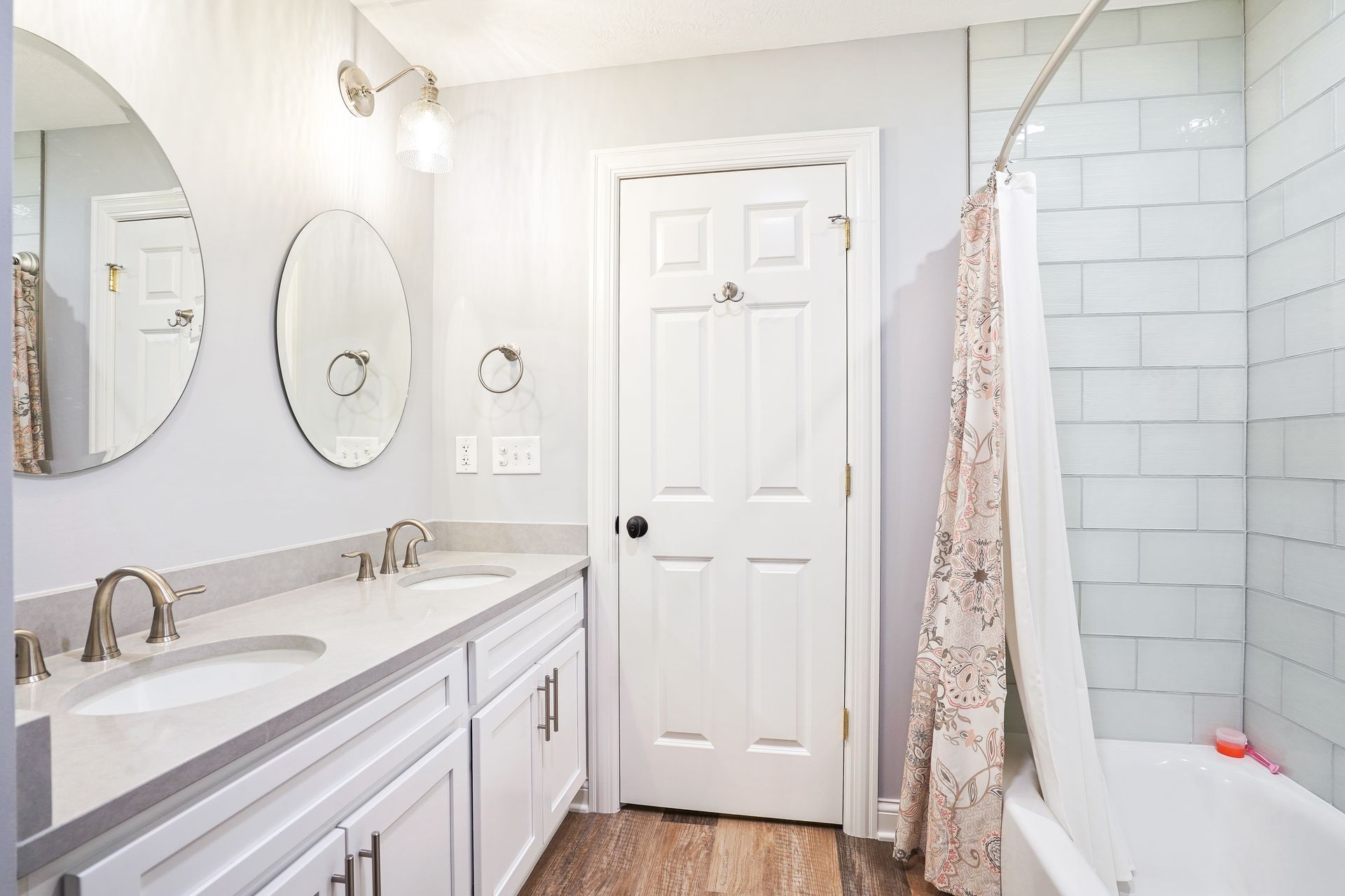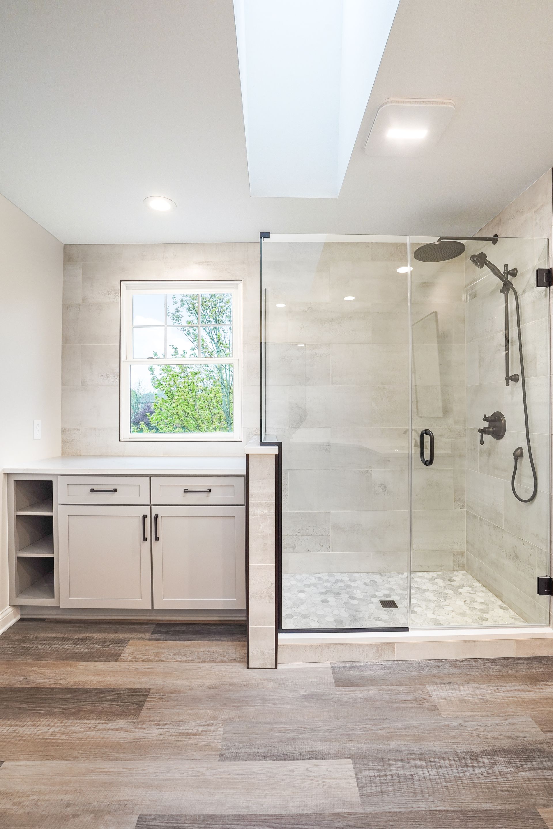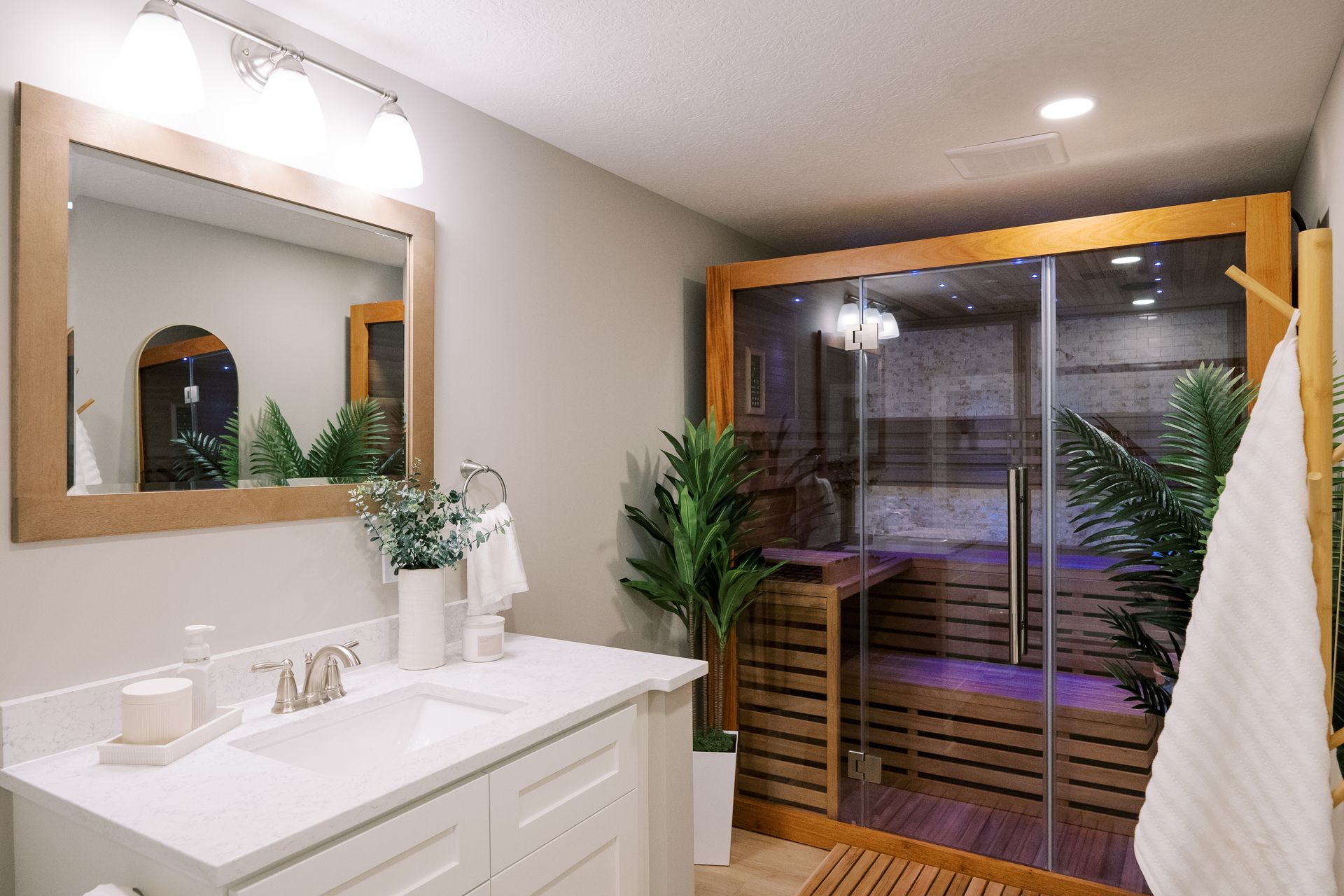 Durable tile or waterproof LVP, ambient lighting, and modern fixtures.