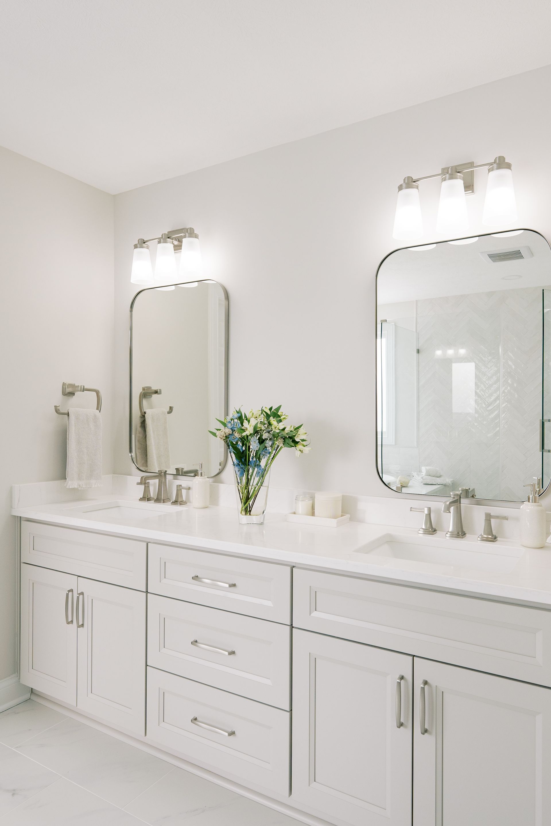 Updated vanities with double sinks, stone tops, and smart storage solutions.